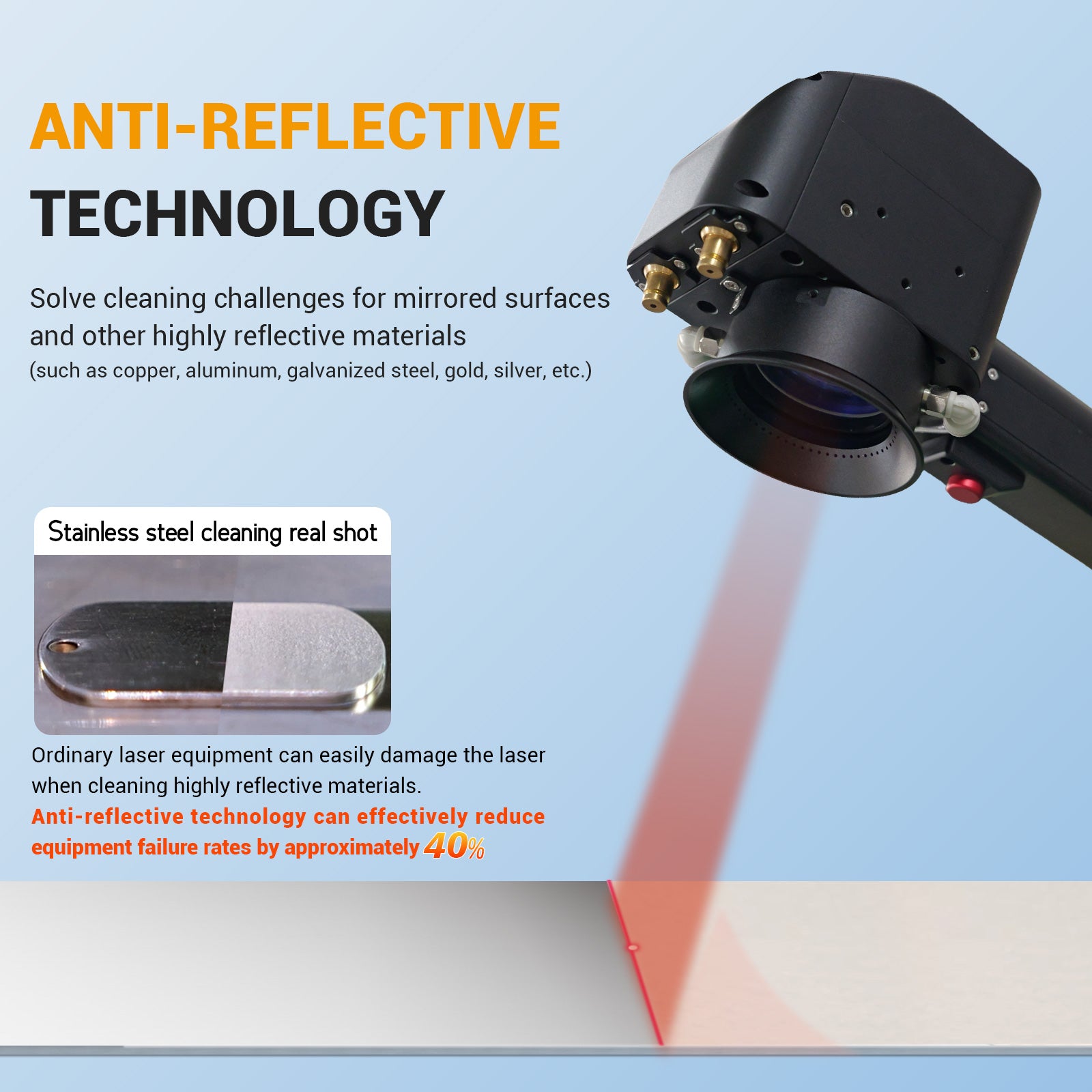 La máquina de limpieza láser pulsada SFX 300W/500W está equipada con tecnología avanzada anti-alta reflexión, lo que garantiza que la fuente láser permanezca segura al limpiar materiales altamente reflectantes como cobre, aluminio, láminas galvanizadas, oro y plata.