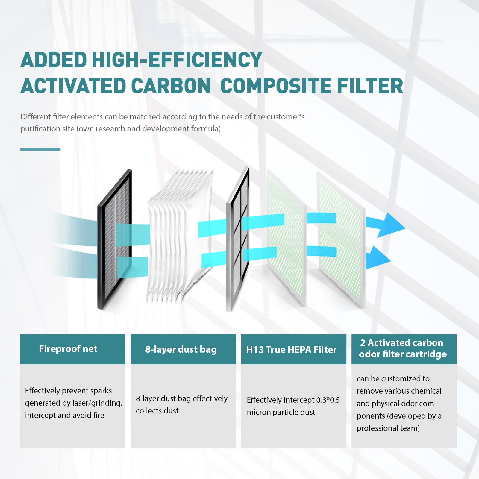 Este purificador de humo industrial portátil y de alto rendimiento (extractor de humos) cuenta con un sistema de filtro compuesto multicapa que combina carbón activado de alta eficiencia con filtración de partículas avanzada.