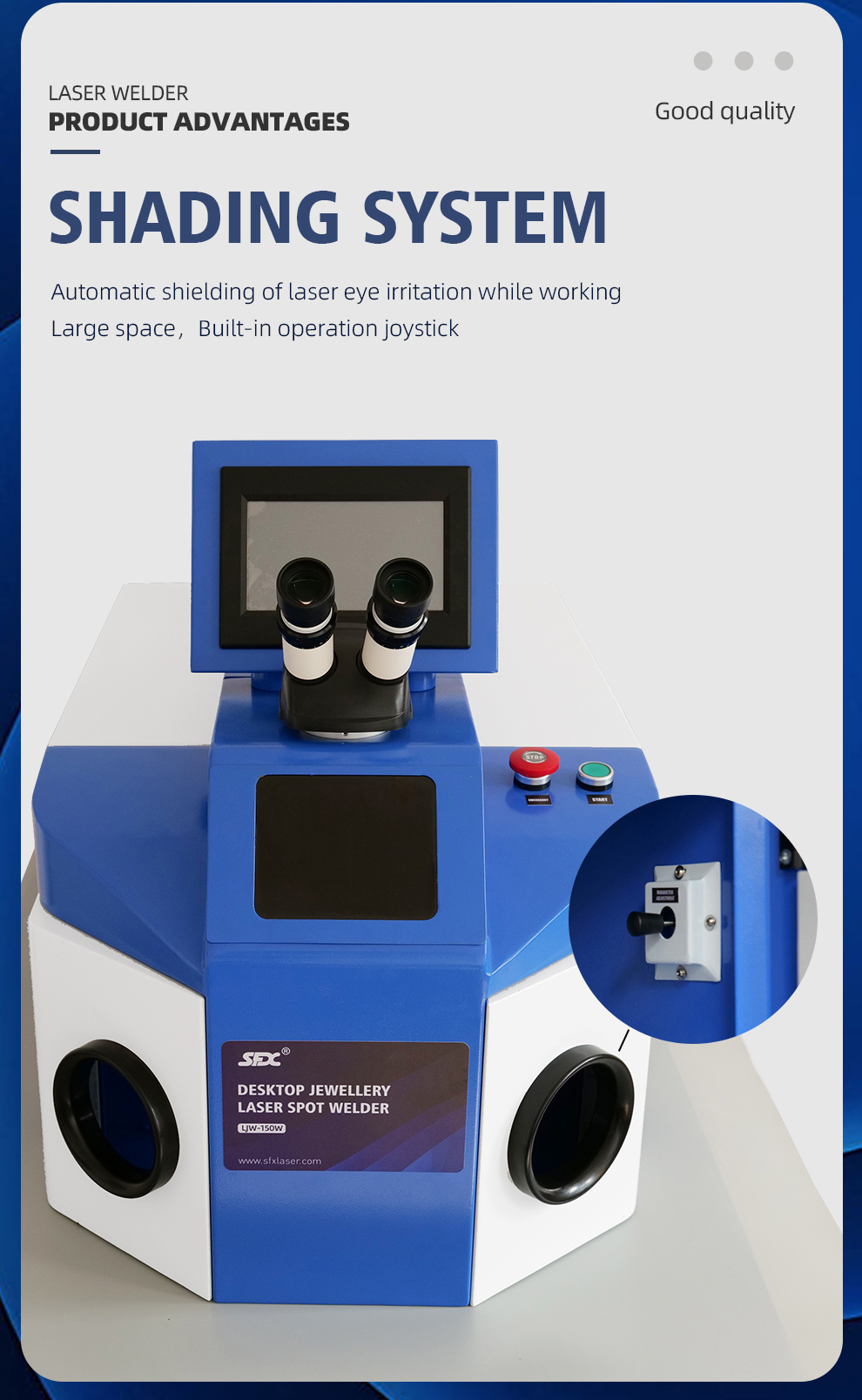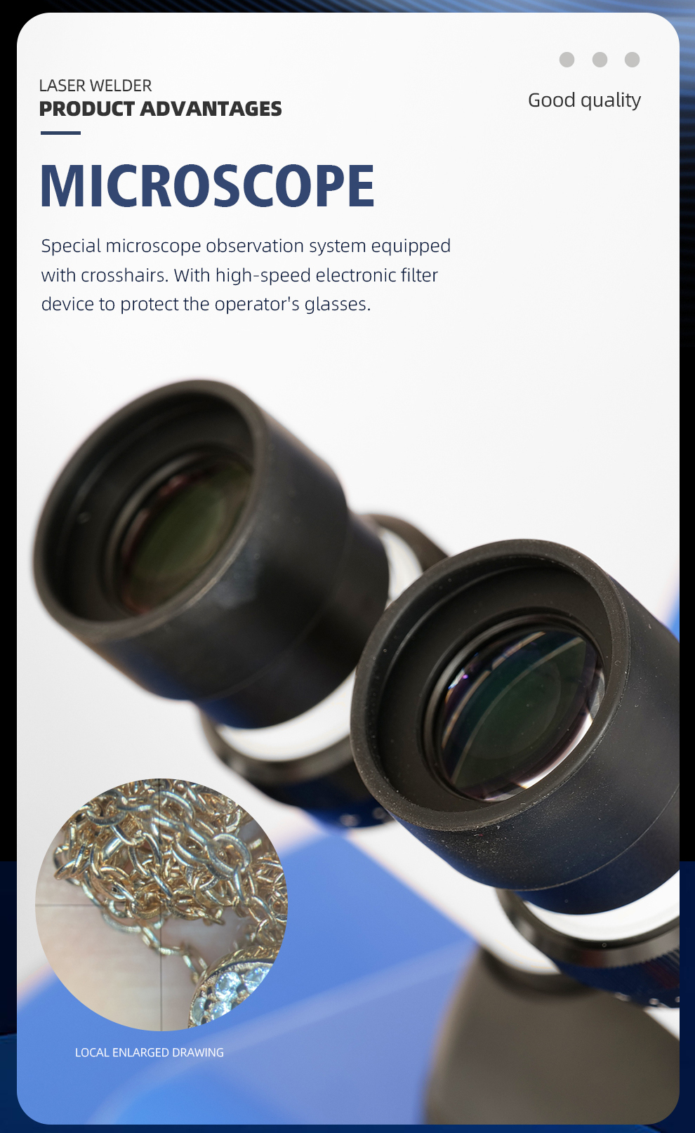 1.Microscope: Special microscope system equipped with crosshairs. With high-speed electronic filter device to protect the operator’s eyes.