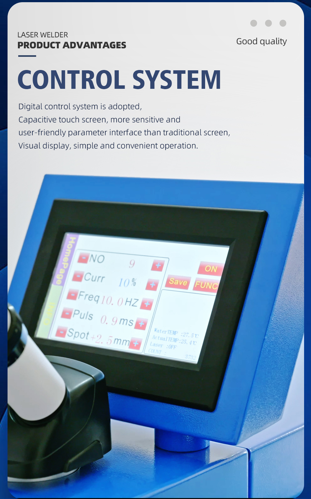 2.Control System: Digital control system is adopted, Capacitive touch screen, more sensitive and user-friendly parameter interface than traditional screen, visual display, simple and convenient operation.