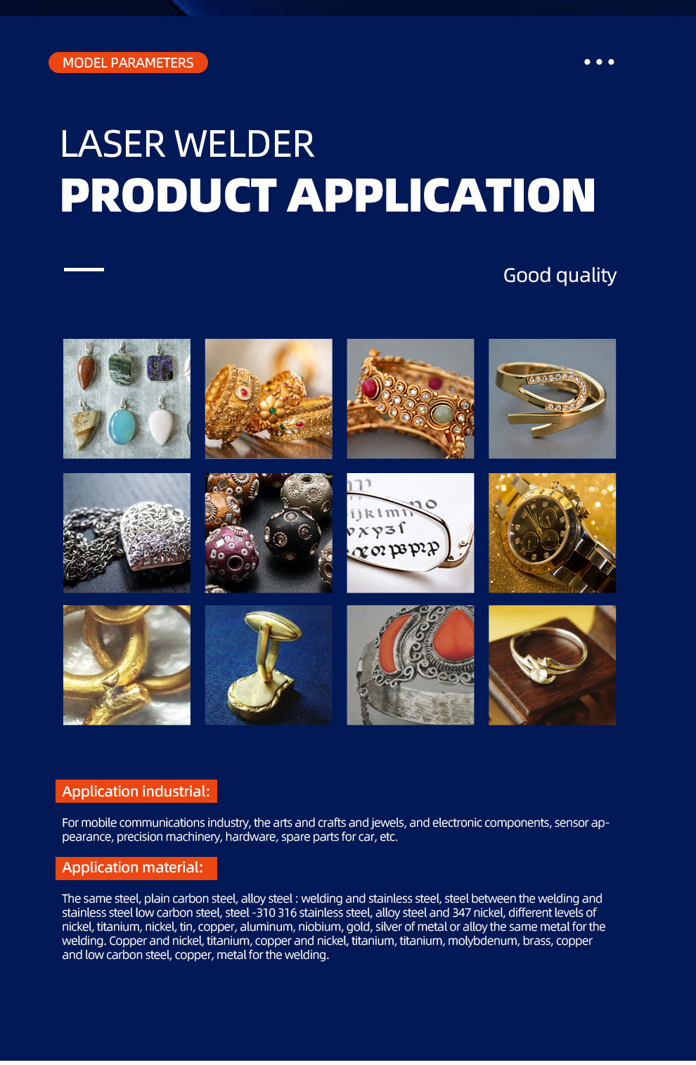 Jewelry laser welding machine is widely used in all kinds of metal, like gold, silver, bronze, aluminum steel and titanium.