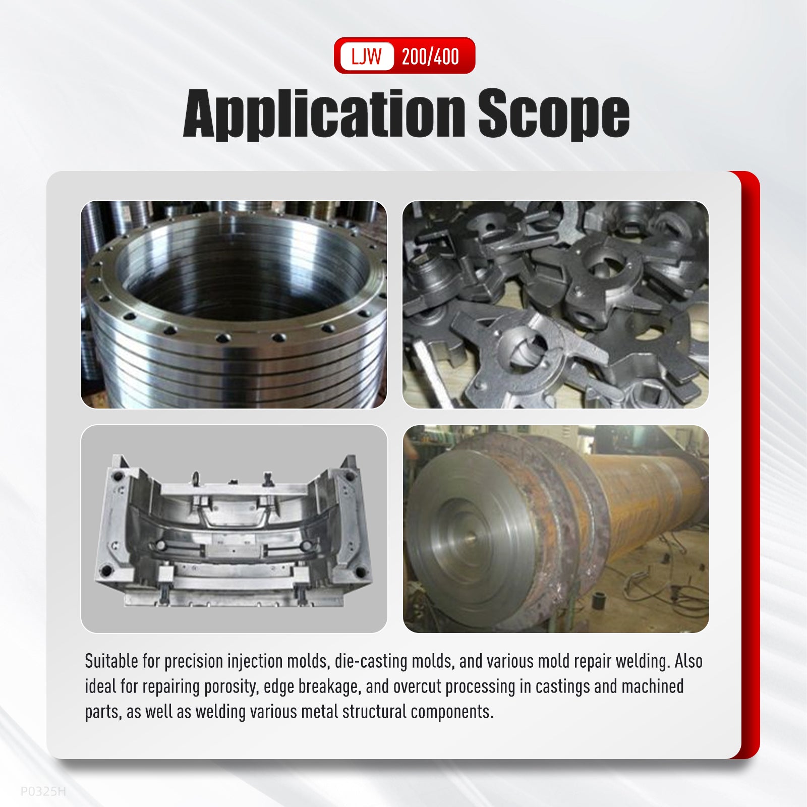 Perfect for precision injection molds, die-casting molds, and general mold repairs. Effectively handles porosity, edge breakage, and overcuts in castings or machined parts. Also suitable for welding various metal structural components.