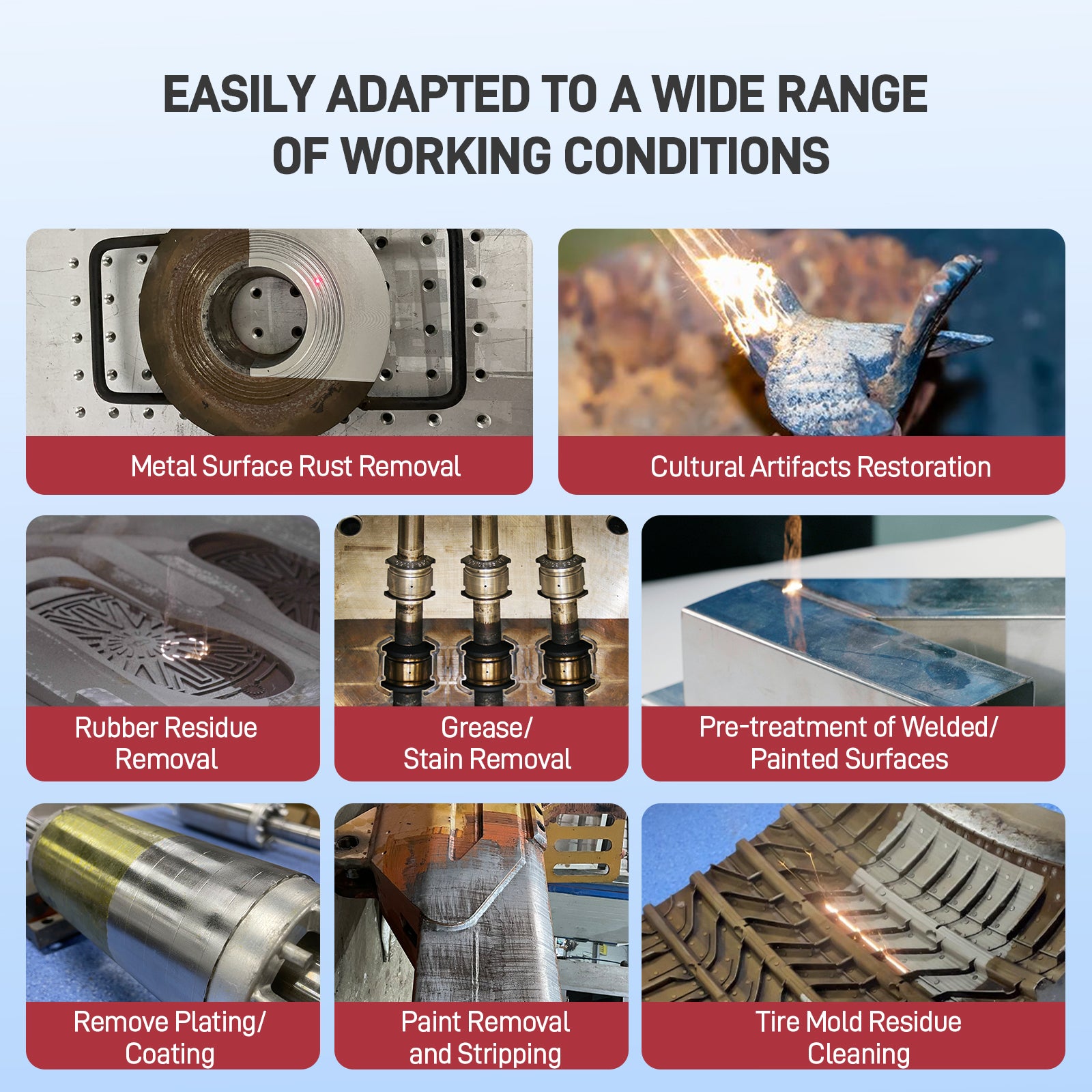 Suitable for industries requiring high gloss, uniform energy cleaning without chemicals or consumables.