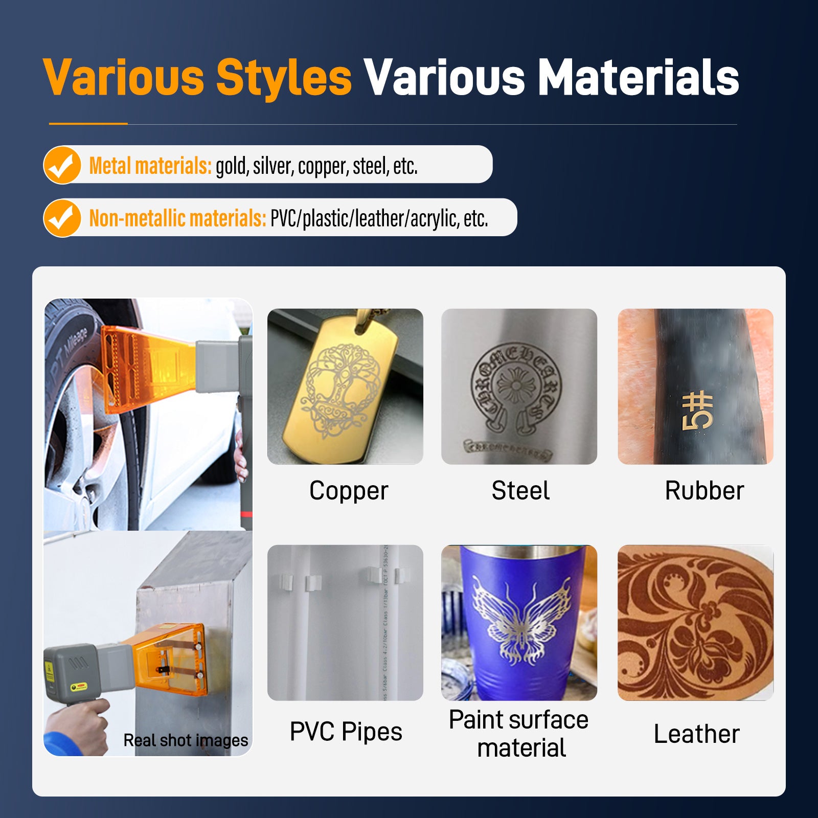 All the metal and most of non-metal, such as Stainless steel, carbon steel, anodized aluminum, aluminum alloy, aluminum, copper, iron, gold, silver, hard alloy, painted metal, other metals, acrylic, PVC, leather, plastic, painted wood boards, etc. Ideal for personalized marking, including trademarks, barcodes, QR codes, text, nameplates, dates, and patterns.