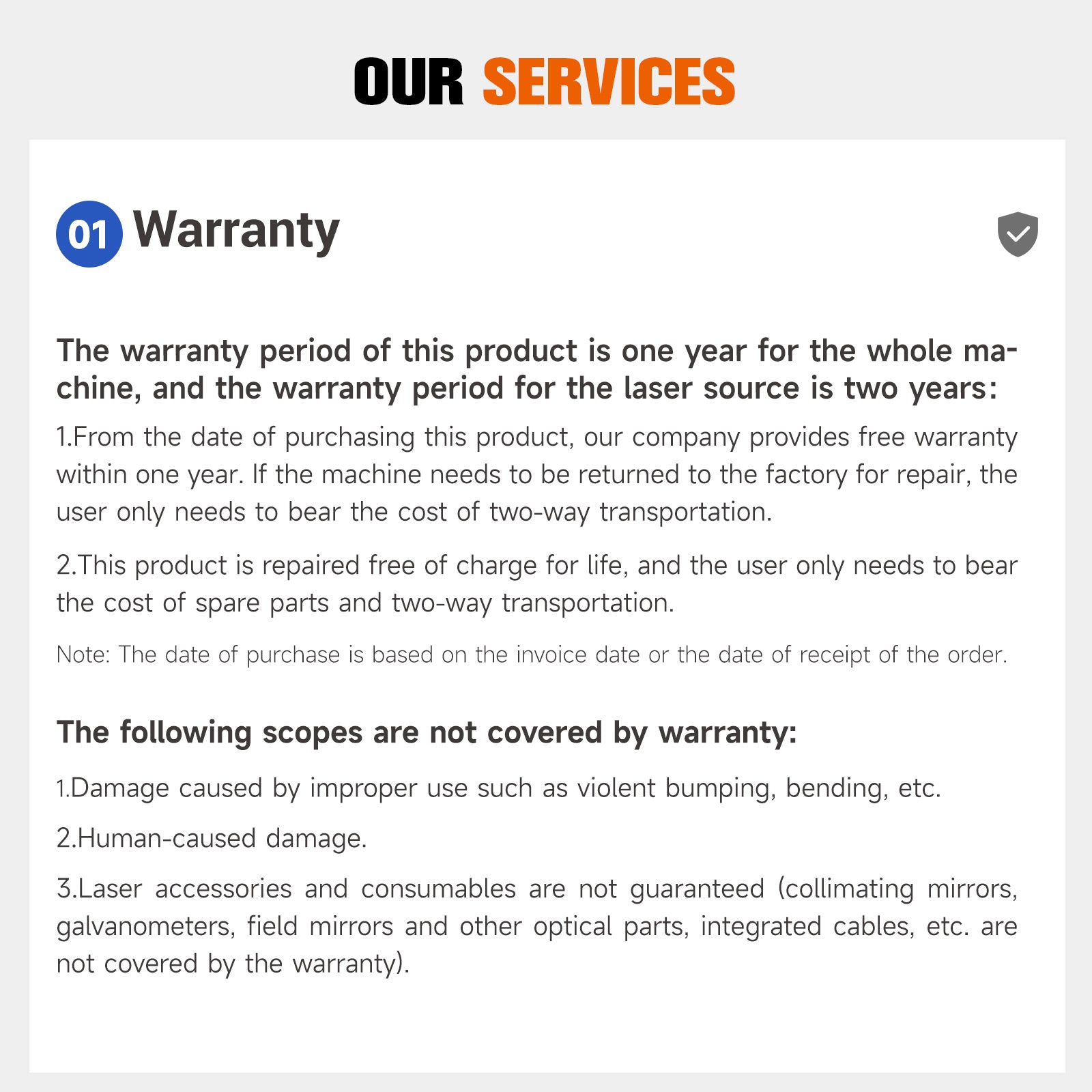 We provide 2 years warranty for the laser source and 1 year warranty for the whole machine. English operation Manual user and video and for you. If there is any technical question with our machine, please tell us,we will replace the accessories you need for free.