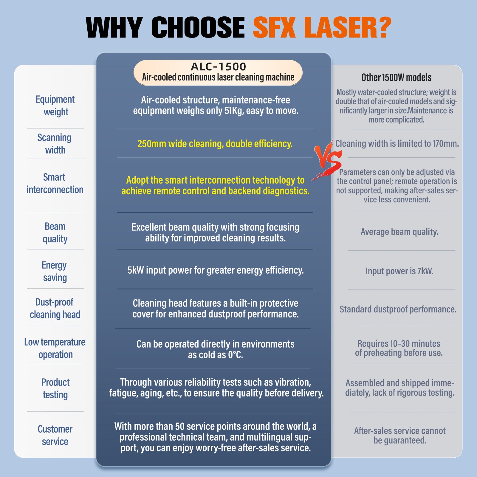 SFX ALC-1500 Laser rust removal machine offers a safe, chemical-free, and highly efficient cleaning solution tailored for industries demanding precision and reliability. Compact, lightweight, and energy-efficient, it supports continuous operation even in extreme environments, making it the perfect partner for your high-end manufacturing needs.